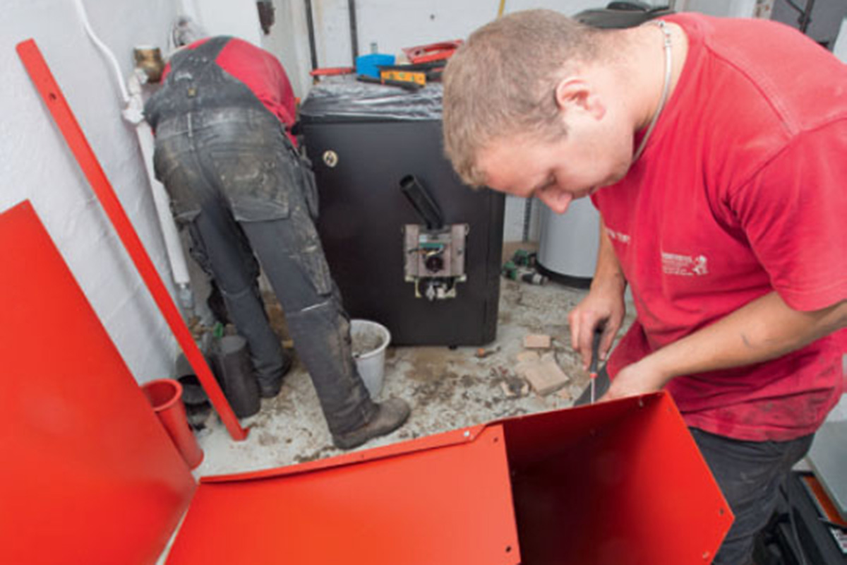 Når rommet er ryddet, kan vi sette i gang. Vi begynner med å sette på plass den nye varmtvannsbeholderen. Her har vi valgt en utgave med ekstra stor spiral. Det er det mest effektive når varmen skal overføres fra fyren til bruksvannet. Deretter begynner forberedelsene til rørene som skal forbinde varmtvannsbeholderen og pelletsfyren. Tilkoblingen av varmtvannsbeholderen er blant tingene du absolutt ikke kan utføre selv.