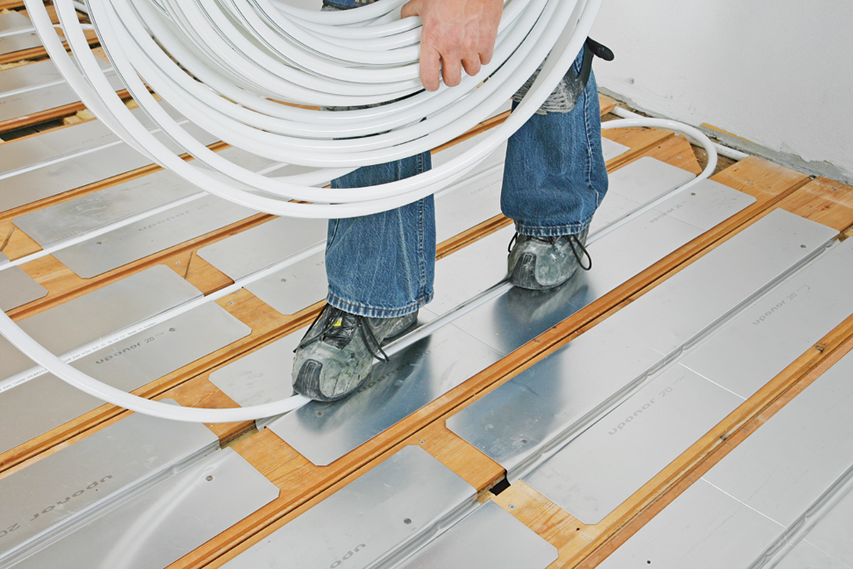 Du kan godt montere pex-røret alene. Du går med rullen i hendene og tråkker varmeslangen ned i sporet på varmefordelingsplatene med føttene.