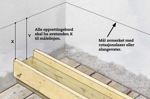 Spenn ut tre snorer på tvers av rommet. Igjen skal det helt like klosser under. Legg lim på opprettings bordet - og hold det opp til snora. Når klossen treffer snora, er bordet i riktig nivå og skrus fast til bjelken.