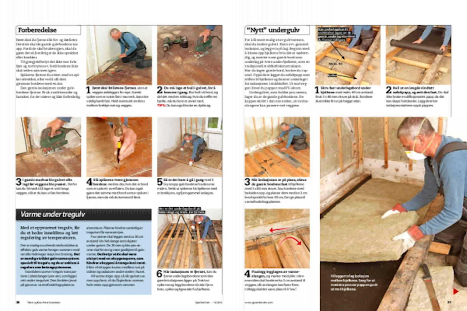 For å få mest mulig ut av gulvvarmen, skal du isolere gulvet. Fjern evt. gammel isolasjon, og legg et nytt lag. Begynn med å klosse opp bjelkene hvis det er nødvendig, og monter noen gamle bord som underlag på tvers under bjelkene, som en tradisjonell stubbloftskonstruksjon. Har du ingen gamle bord, bruker du rupanel. Oppå dem legger du asfaltpapp som stiftes til bjelkene og danner underlaget for isolasjonen i stubbloftet. Ut mot veggen limer du pappen med PU-skum.