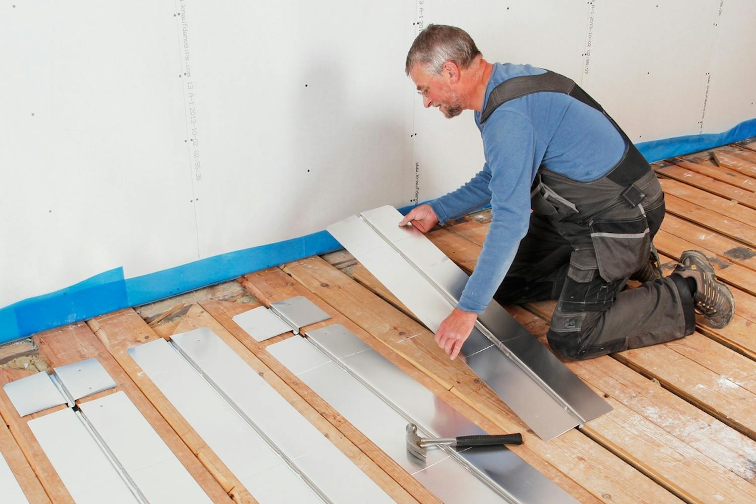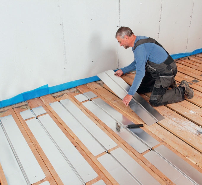 Før du legger ut varmeslangene, skal du legge varmefordelingsplater. De tynne aluminiumsplatene legges ut så sporet der pex-røret skal klemmes fast ligger mellem to gulvbord.
