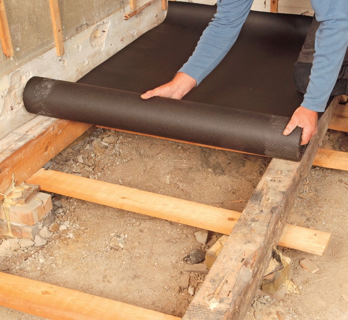 På dette gulvet legger vi en dampsperre under ullpappen og klikkgulvet. Tidligere har det vært advart mot dette i konstruksjoner med stubbloft over grunn. Årsaken er at dampsperren kan gjøre at fukt fra grunnen trenger opp og stenges i konstruksjonen, i stedet for å bli luftet ut opp gjennom gulvet. Samtidig er damptrykket fra innsiden av huset lavest ved gulvet. Men med tettere hus, stiger også damptrykket mot gulvet. Når krypekjel-ler og sokkelrom under gulvet i tillegg er riktig laget, og helt tørt, er det en fordel å legge dampsperre som vi viser deg her.