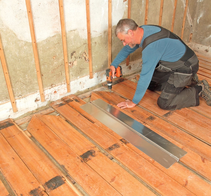 Når isolasjonen er på plass, skrus de gamle bordene fast til bjelkene med 5 x 80 mm skruer. Snu bordene med baksiden opp, og plasser dem med en 3 cm bred sprekk for hver 30 cm. Det gir plass til varmefordelingsplatene.
