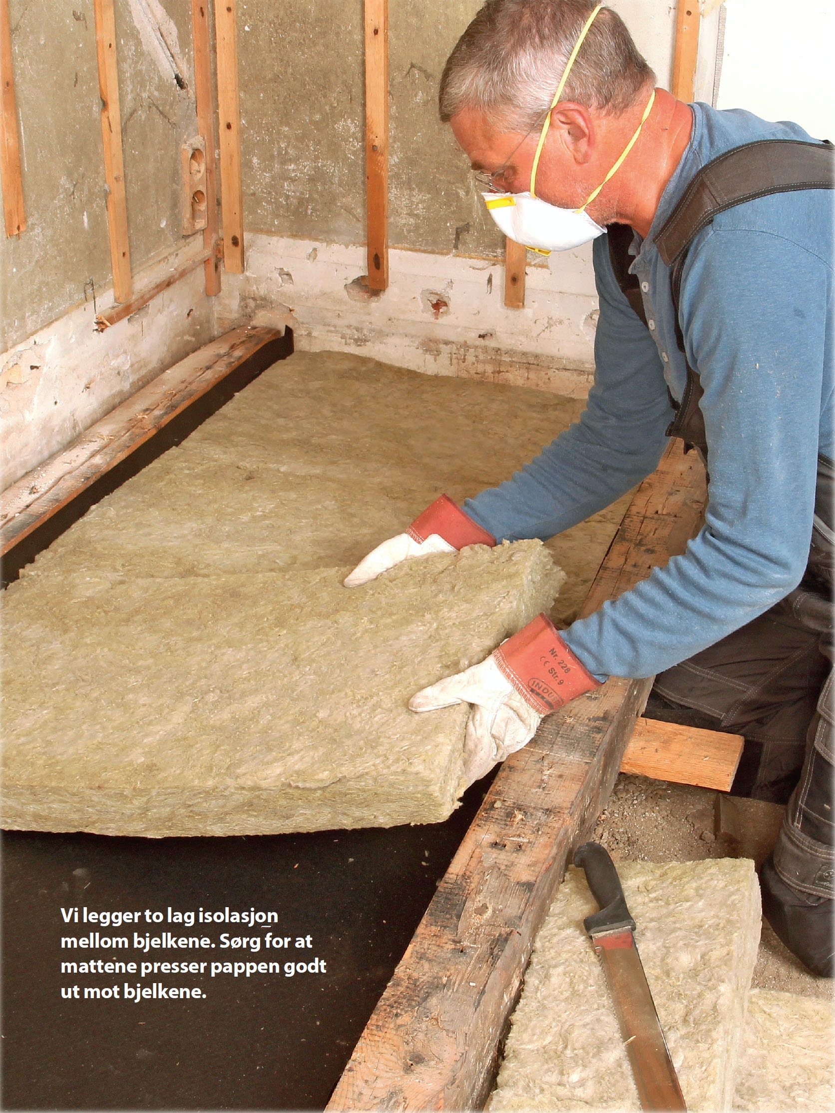 Den gamle isolasjonen under gulvbordene fjernes. Bruk ansiktsmaske og hansker, for det støver og klør forferdelig.