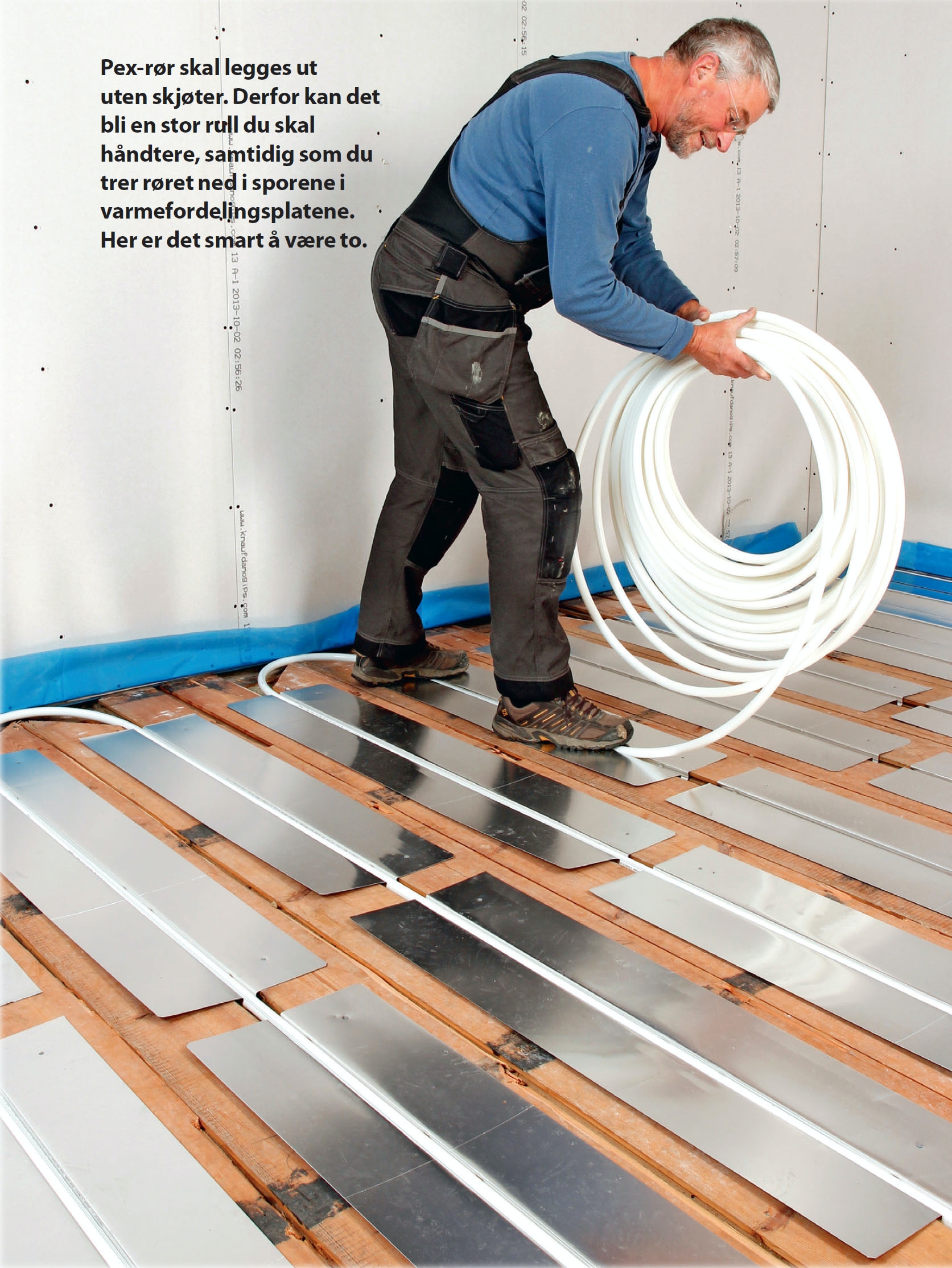 Når selve pex-røret skal legges ut, er det en fordel å være to. Det blir fort 50-75 meter slange å dra på, mens du strever med å få lagt den ned i sporet på gulvet. Det kan skape litt problemer.