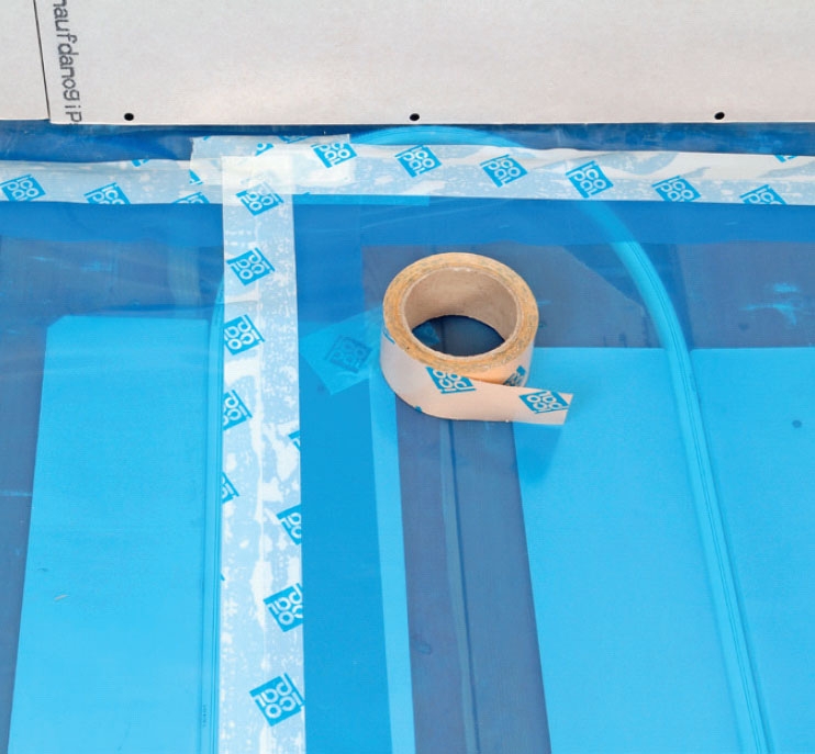 Teip over alle skjøter med dampsperreteip. Det gjelder skjøter mellom lengdene og mot alle vegger, med og uten dampsperre.