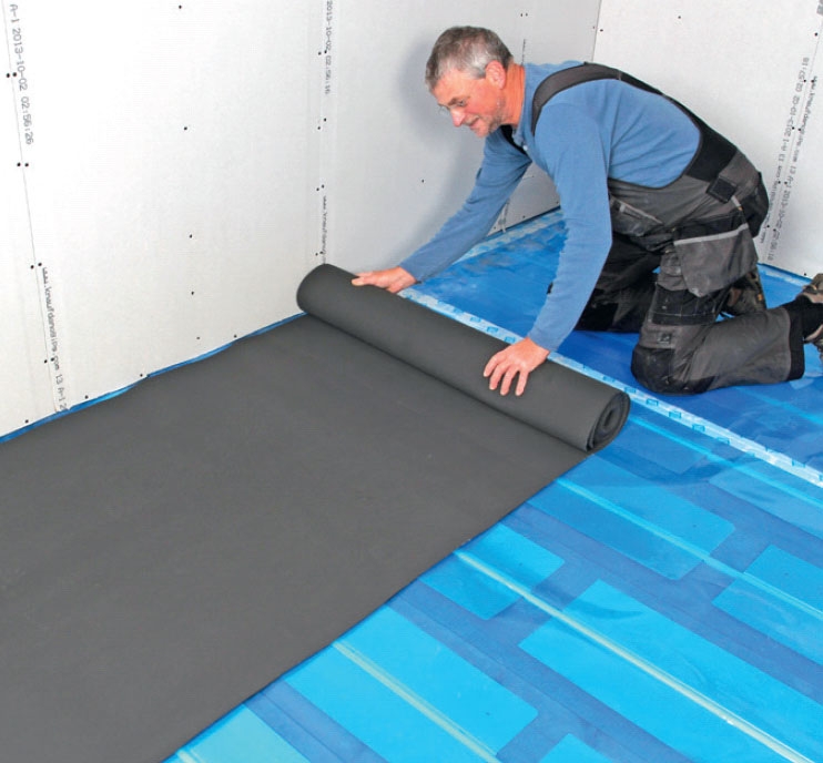 Rull ut et trykkfordelende og trinnlyddempende underlag, én lengde om gangen, og legg det nye tregulvet oppå. Lengdene legges med 5 mm avstand, slik at de ikke overlapper og skaper høydeforskjeller.