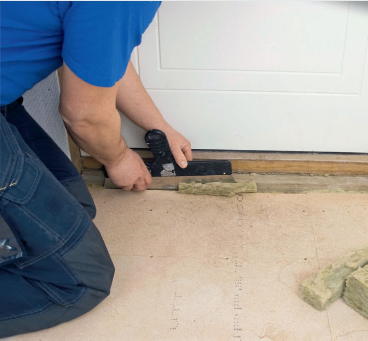 Gulvet gjøres klart til sparkelmassen som skal oppå varmeslangene. Alle hull og sprekker mellom gulv og vegger må tettes. Her gjør vi det med mineralull, som presses hardt sammen.