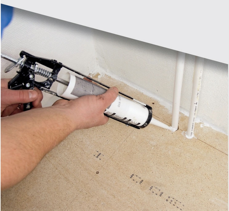 Vi fuger rundt alle rør med akrylfugemasse, fugeskum eller annet som tetter hullene. Dette hindrer den flytende sparkelmassen å renne gjennom.