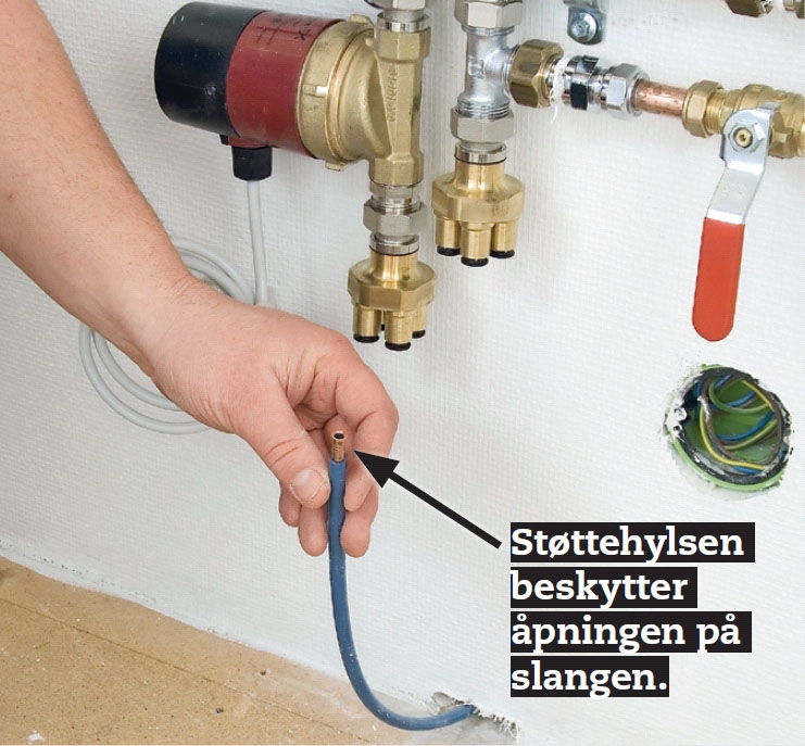 Den ene slangen kobles til fordeleren. En liten støttehylse (en bit metallrør) settes i varmeslangen før slangen settes på fordeleren. Støttehylsen forhindrer at slangen kommer i klem når den spennes fast.