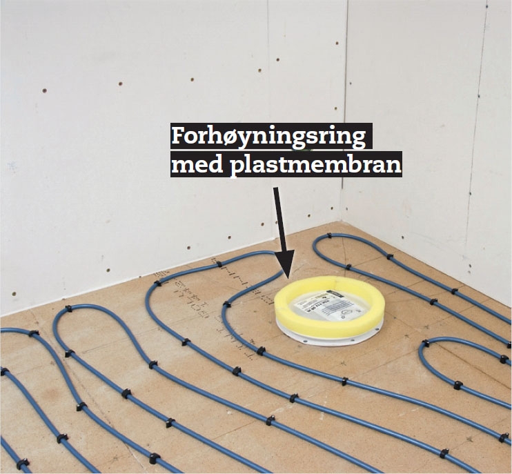 Installatøren forhøyer først avløpet med en ring, som skal sikre at det kommer opp i riktig høyde på det ferdige gulvet.