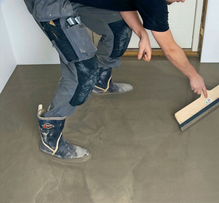 Når all sparkelmassen er fordelt, glattes den med en bred sparkel. Avstandsbrikkene viser når det er nok masse på gulvet. Spor fra gummistøvlene fyller du igjen etterpå.