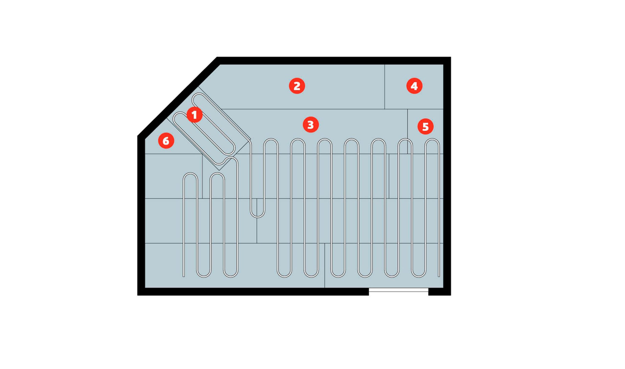 Platene finnes også med ferdige spor, men de egner seg ikke til denne oppgaven. I stedet velger vi å montere vanlige våtromsplater og deretter frese spor til varmeslangene selv.