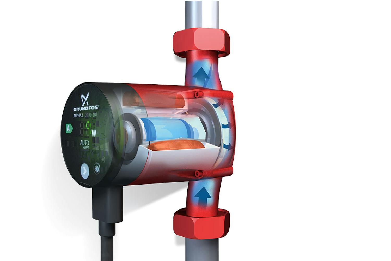 Pumpehuset av støpejern inneholder pumpe og motor. Ny teknologi gjør at de to delene tar langt mindre plass enn eldre modeller. Siden det er standard-avstand mellom tilslutningspunktene, vil en ny, mer energivennlig modell passe inn der den gamle satt.