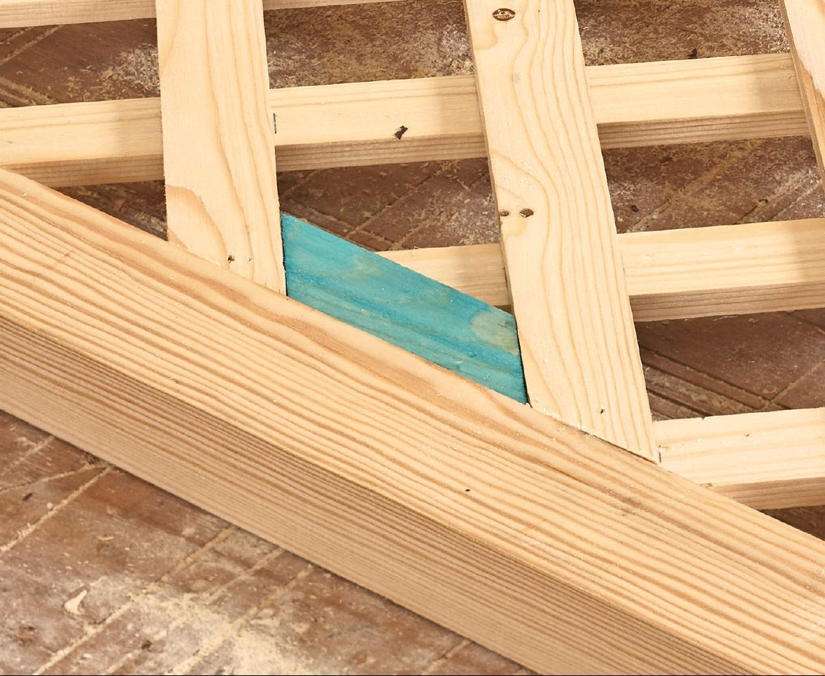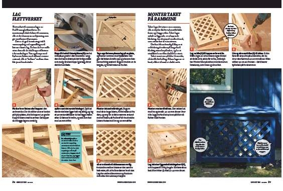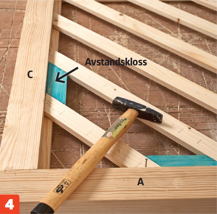 Monter det andre listelaget. Begynn med de to lange listene, fordel resten ut fra dem, og sørg for at det er samme avstand mellom listene, så “hullene” blir kvadratiske. Listene festes med lim og 30 mm stifter.