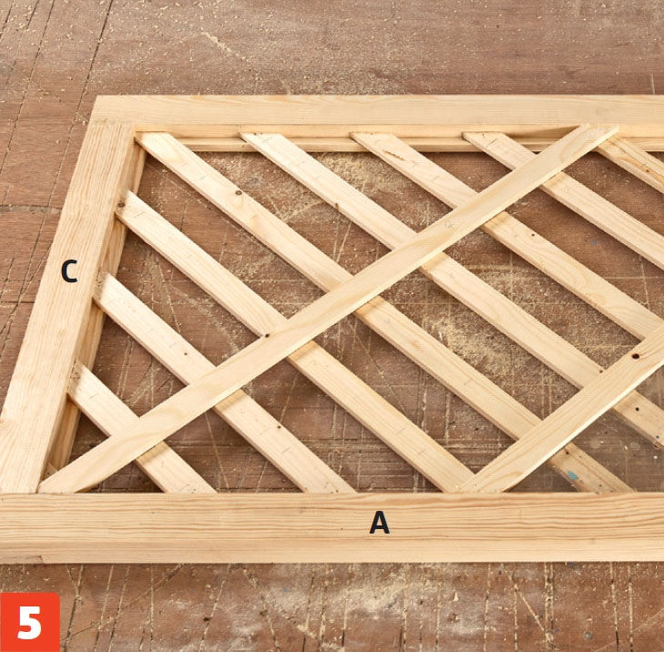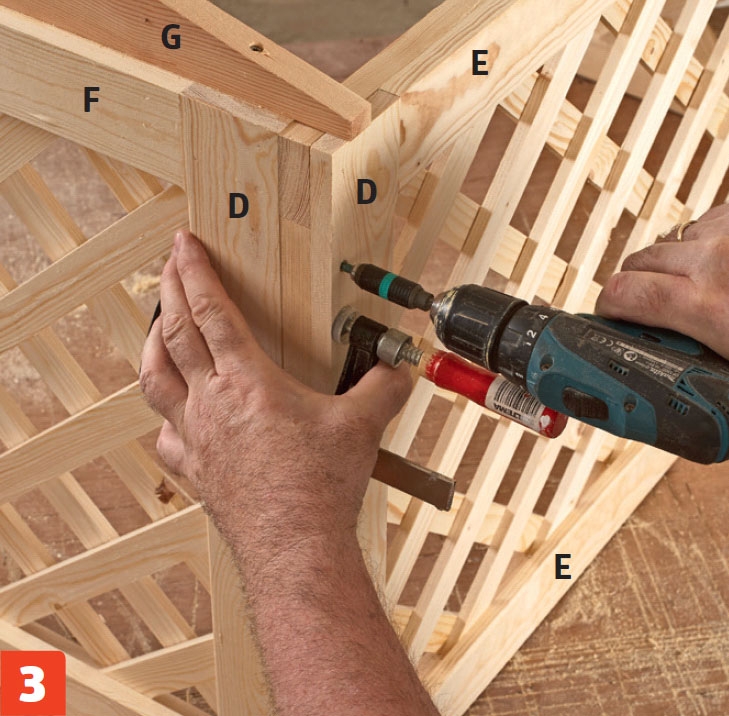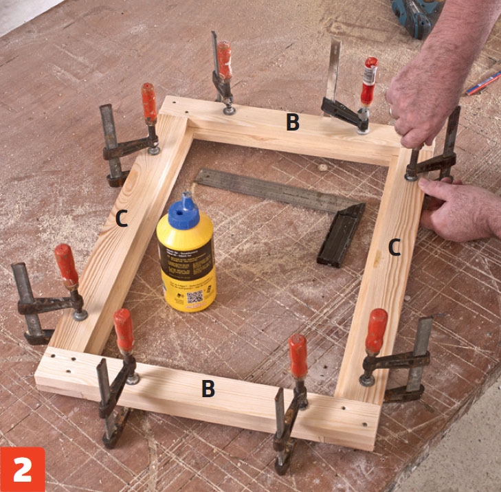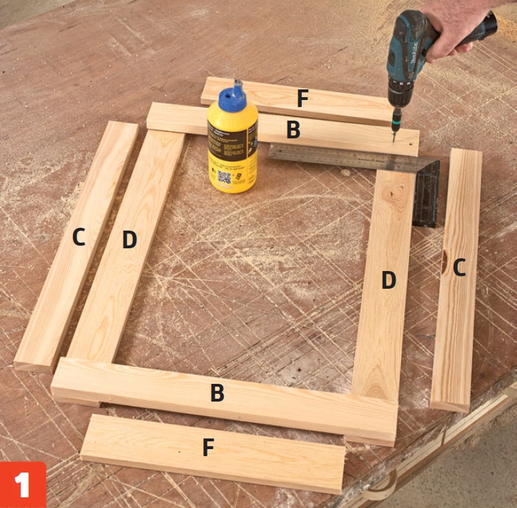 Listene til rammene settes sammen. Plasser listene (D), og legg listene (B) oppå, slik at de flukter i hjørnene. Legg på vannfast trelim i skjøtene, og skru fast med 3 x 30 mm skruer. Sjekk med vinkelen.