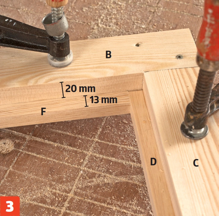 Monter listene (C) og (F). Listene (C) skal tilpasses stramt mellom listene (B), og listene (F) tilpasses mellom listene (D). Når du har kappet dem til, legger du på lim, og holder dem fast med tvinger.
