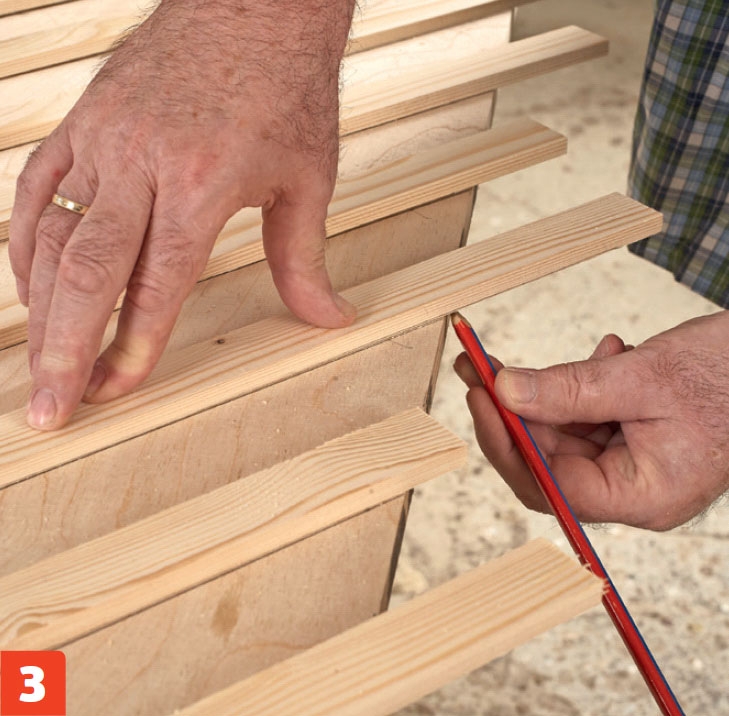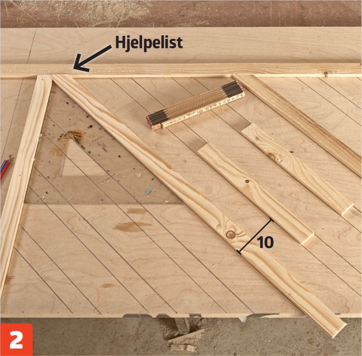 Tegn opp listenes plassering på en plate, og marker rammen med hjelpelister. Det gjør det lettere å måle opp og plassere listene med riktig avstand. Begynn med en av de lengste, og fordel resten ut fra den.