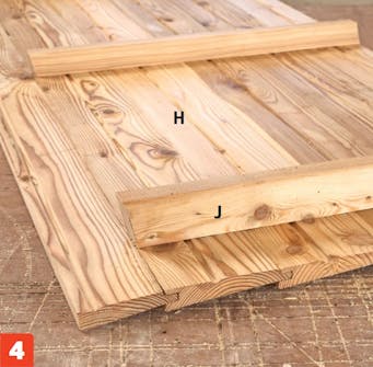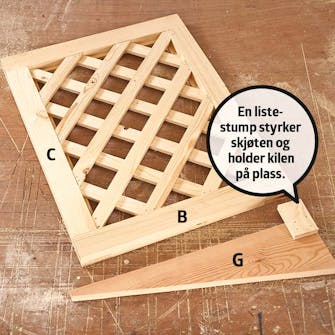 Lag en kile (G) til toppen av hver side. Kilene lages av et bord som sages til med et skrått snitt, så du får to like, skrå stykker. Monter kilen på sidens innside med en listestump, som limes og skrus fast.
