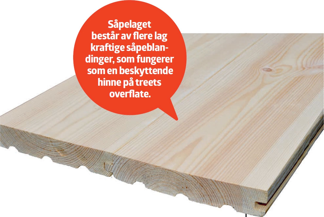 Såpe gir et flott, matt utseende, men trenger ikke ned i treet og metter det ikke i dybden. Såpelaget bygges opp i flere omganger med kraftige såpeblandinger. Jo flere lag såpe, desto bedre beskyttelse.