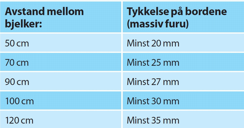 Du kan legge et gulv direkte oppå bjelkene ved å skru eller spikre massive planker eller kraftige lamel lbord fast på tvers av bjelkelaget. I begge tilfelle skal bordene være så tykke at de kan bære det frie spennet mellom bjelkene (se tabell).