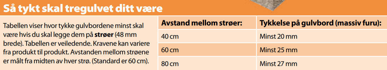 Du kan legge et massivt heltregulv direkte oppå strøene. Ved å supplere med ekstra strøer, slik at avstanden mellom dem blir mindre, kan du legge relativt tynne gulvbord.