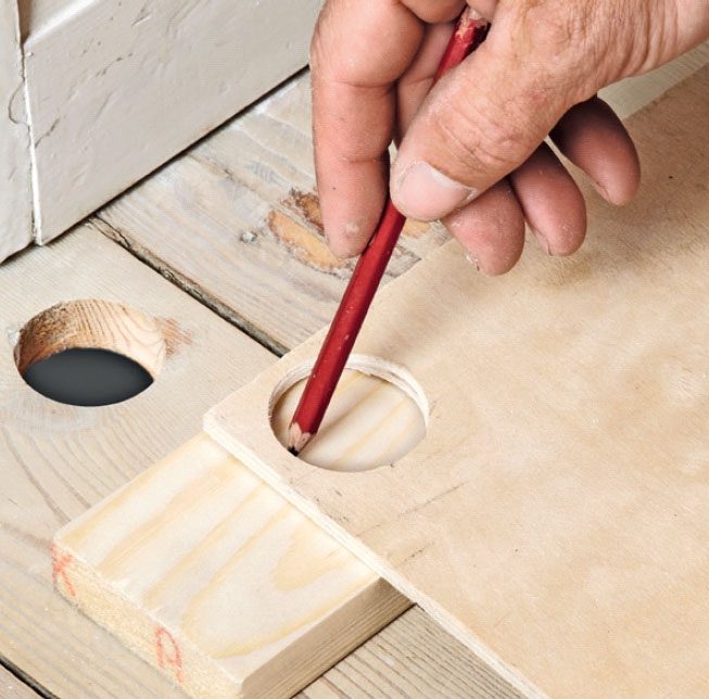 Legg en kryssfinérplate oppå hullet, og bor gjennom platen med et bor som er litt større enn hullet. Tegn opp proppen på en trekloss, og sag den ut.