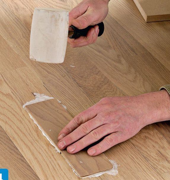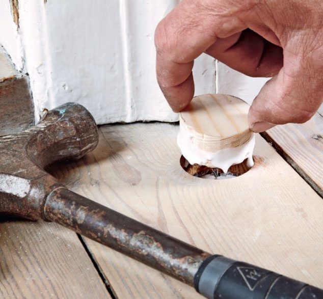 Smør trelim på proppen, og bank den på plass i hullet med en kloss og en hammer. Slip først kantene med grovt slipepapir, og sjekk at den passer.