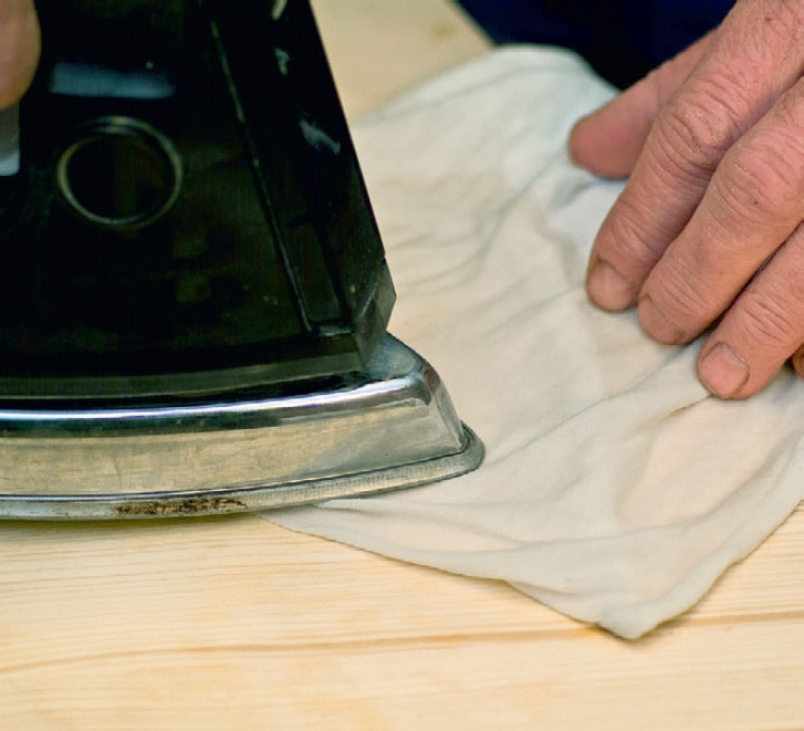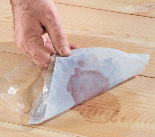 Har du hatt en litt for våt eller klossete kveld, og sølt rødvin på et lyst tregulv, er det ingen katastrofe. Selv inntørkede rødvinsflekker kan fjernes med den viste metoden. Behandlingen kan være hard for treet, så det er en god idé å gi det en omgang olje, såpe eller lignende etterpå, alt etter hva gulvet er behandlet med.