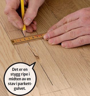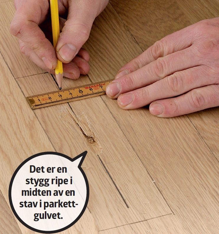 En dyp ripe i parkettgulvet kan se så voldsom ut, at du tror gulvet må skiftes, men det er ikke nødvendig. Du kan nøye deg med å bytte ut staven som er ødelagt med en såkalt lus - et trestykke skåret ut av en rest fra parkettgulvet.
