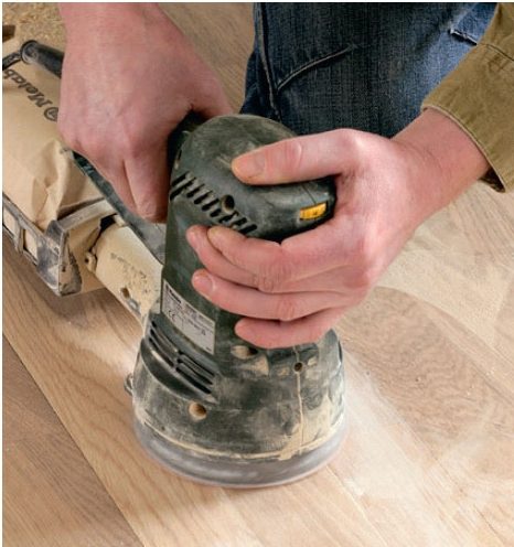 Gulvet kan heller ikke slipes, fordi det vil ødelegge det øverste belegget på gulvet. Måten å fikse de mørke flekkene på, er derfor å legge på litt maling, som matcher fargen på gulvet så godt som mulig.