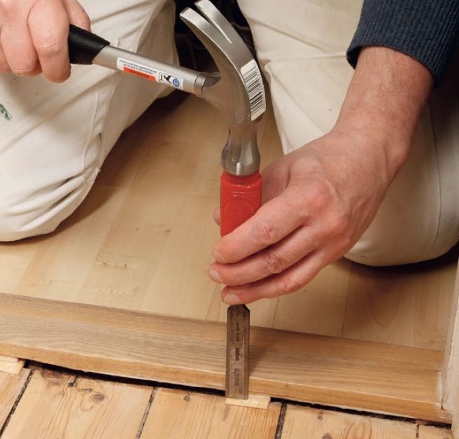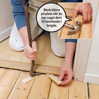 Kloss opp trinnet med kiler, som settes parvis midt på og i sidene. Første kile dyttes inn med den tykke enden først, den andre motsatt oppå. Sjekk at terskelen er rett.