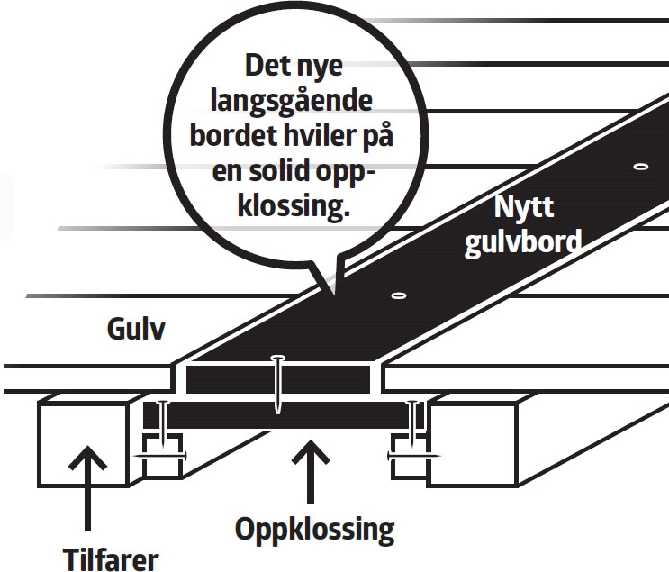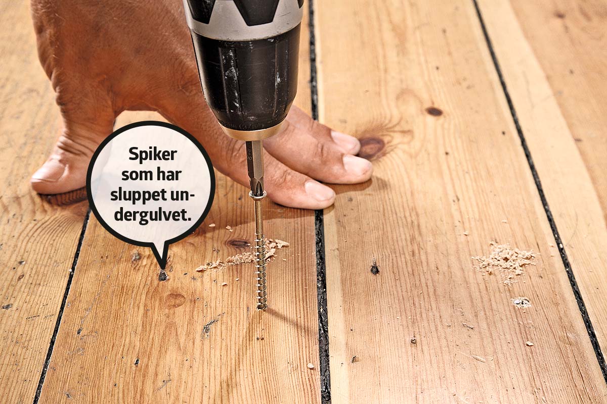 Det blir raskt et daglig irritasjonsmoment, hvis dørterskelen svikter og lager lyder hver gang noen tråkker på den. Årsaken er at den ikke er understøttet godt nok, slik at den gir seg litt når noen tråkker på den. Hvis du vil fikse terskelen, må du klosse den opp skikkelig.