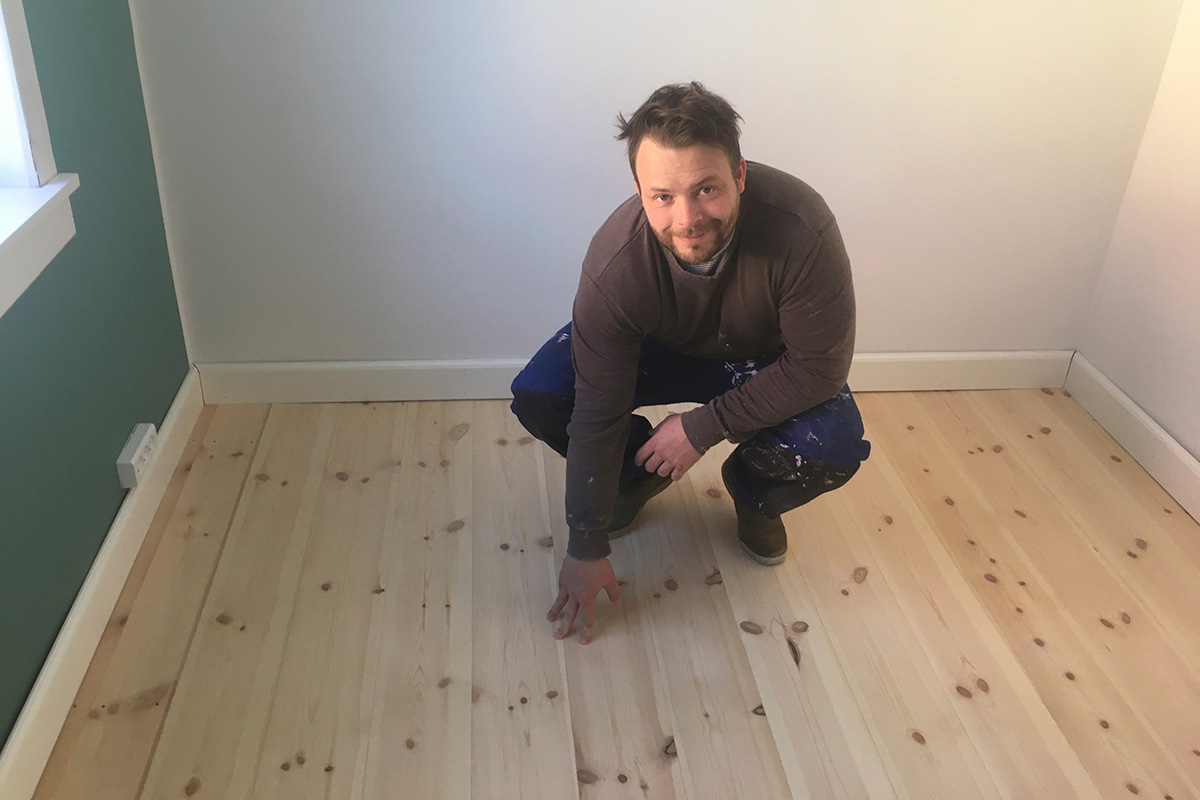 Kapp til det første bordet. Det skal være 5 mm luft ut mot veggen i begge ender, slik at treet kan bevege seg. Men husk at det ikke skal være så mye luft at fotlistene ikke kan dekke sprekken.