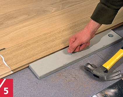 En slagkloss av nylon er rask å flytte rundt på når bordet skal slås på plass. Men ellers kan du også bruke en bit av et gulvbord som slagkloss.