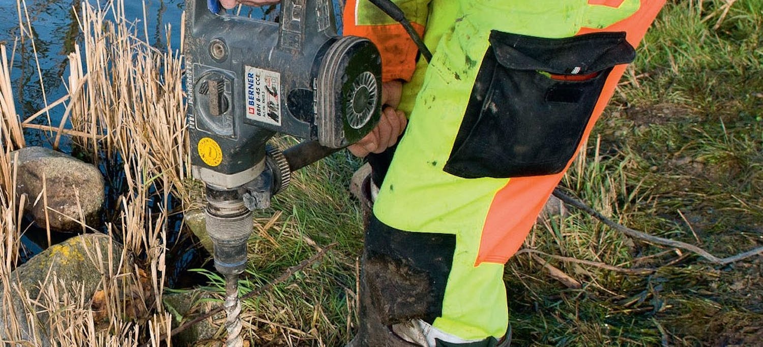 Hull til stolpeskoene bores med et 20 mm murbor i en kraftig borhammer. Du borer på linje, så loddrett som mulig ned til samme nivå.