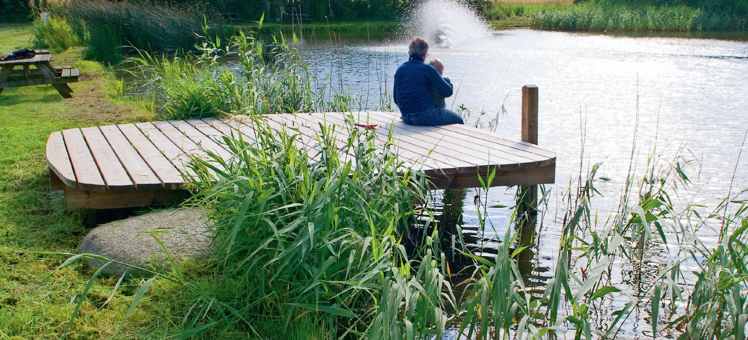 Vi har skapt en bunnsolid og sterk brygge. Nå vil vi ha den til å fremstå som et mykt og pent element i naturen. Det er litt av en kunst å unngå rette linjer og lange sirkelslag, og her er det beste hjelpemiddelet en lang trelist uten kvister. Når den spennes opp mellom tre dykkert, danner den en krumming som retter seg opp mot endene. I hjørnene runder vi av med et sirkelslag, der en stift og en snor fungerer som passer. Du må prøve deg frem og rette inn, slik at plankene ikke blir for sårbare.