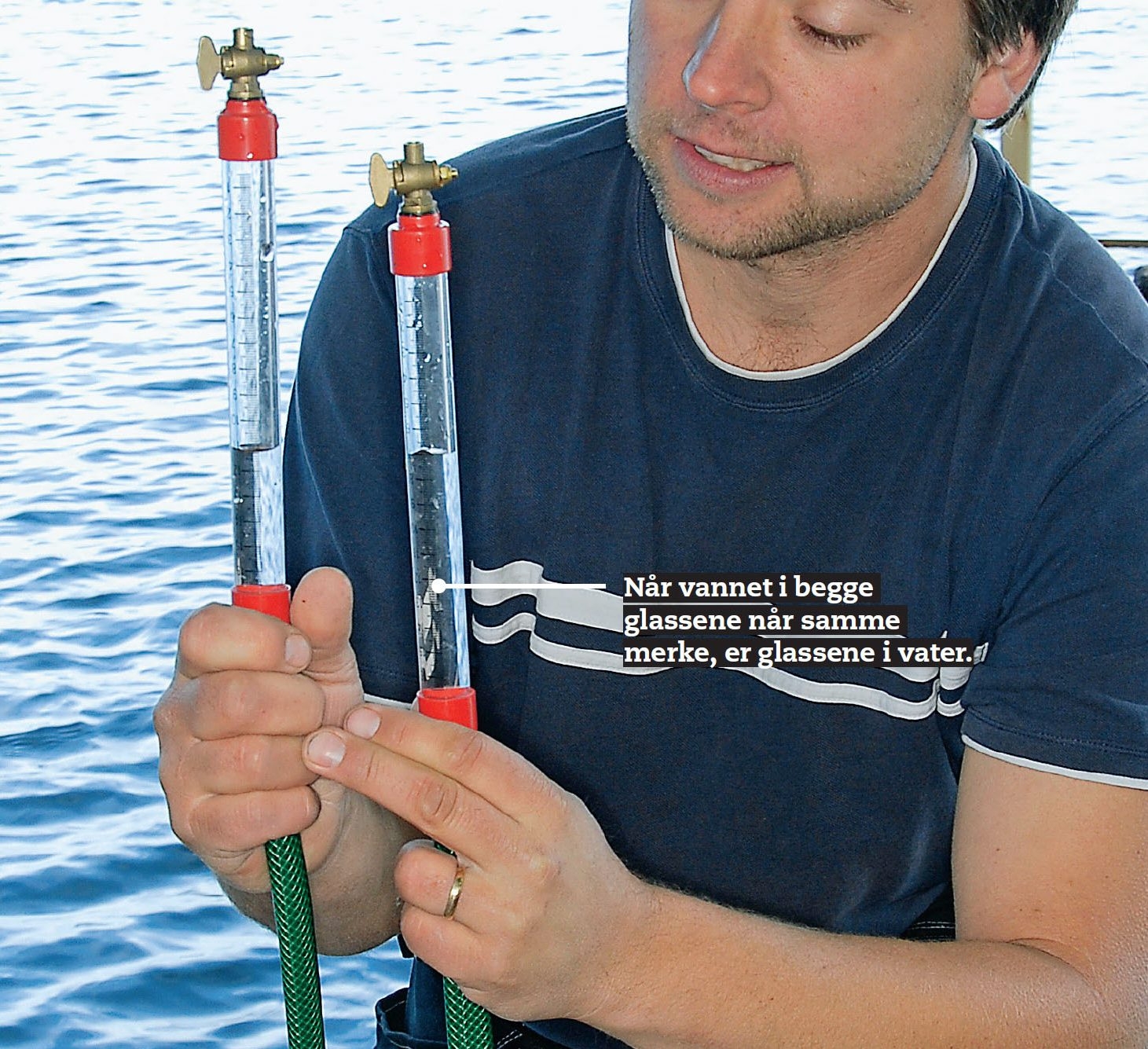 Velg høyde på brygga. Vi har tatt utgangspunkt i ønsket høyde ved strandkanten. Sett det ene røret på slangevateret fast i denne høyden. Når vannet i det andre glasset når samme merke, er glassene i vater.