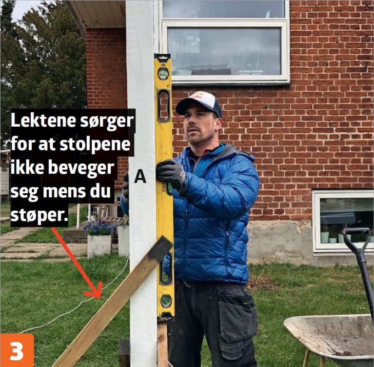 Plasser den første stolpen (A), og kontroller med vateret at den er i lodd i begge retninger. Skru et par midlertidige skråstivere fast på stolpen, slik at den ikke flytter seg når du fyller hullet med betong.