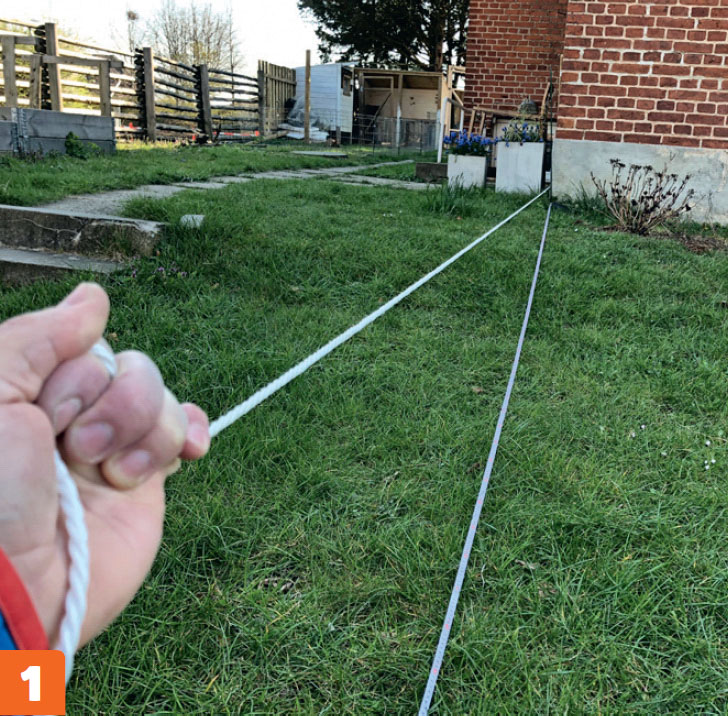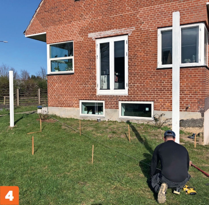 For at terrassen skal flukte med huset, festes en snor på siden av veggen, slik at stolpene kan plasseres etter den.