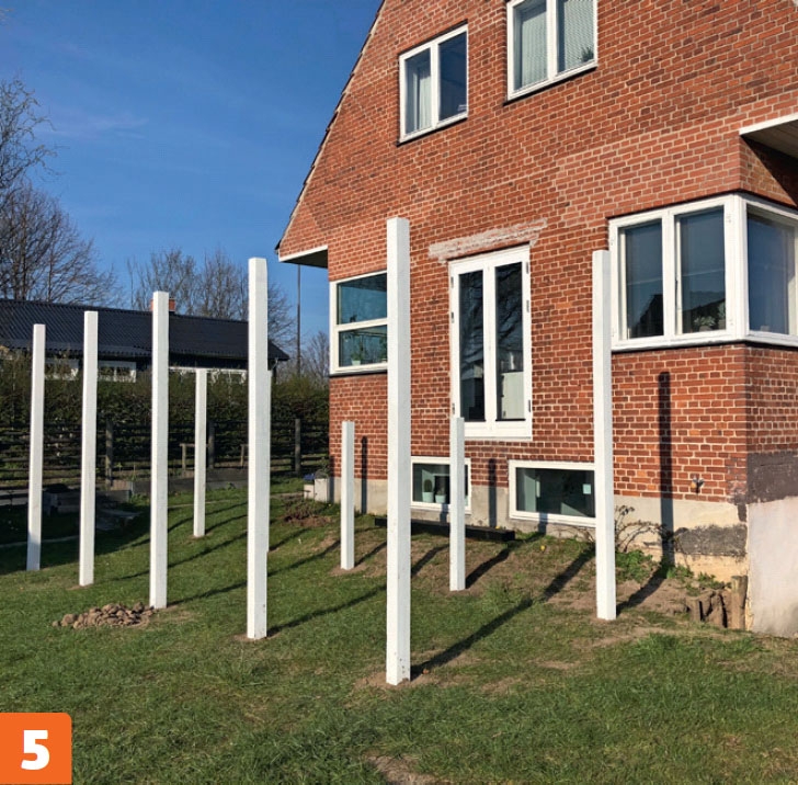 For å unngå unødig oppretting senere i byggeprosessen, sørger vi for å plassere stolpene på en snorrett rekke. Her lager vi hull til stolpene ned til frostfri dybde med et jordbor, og sjekker fortløpende at stolpene er i lodd når de plasseres. Når stolpen står som den skal, heller vi cirka 15 kg tørrbetong ned i hullet, gir det litt vann og dekker det med jord. Deretter banker vi ned par lekter som spennes fast til hver stolpe, for at de ikke skal flytte seg.