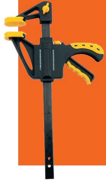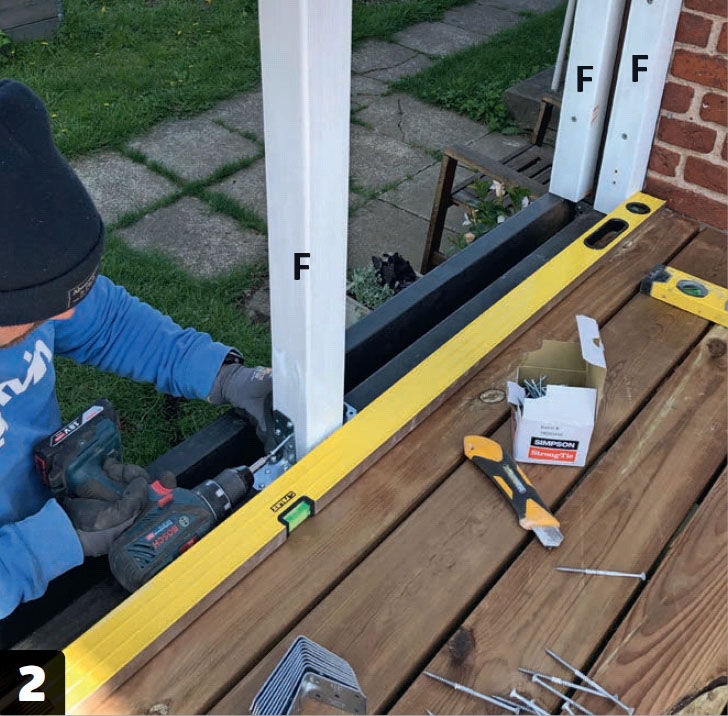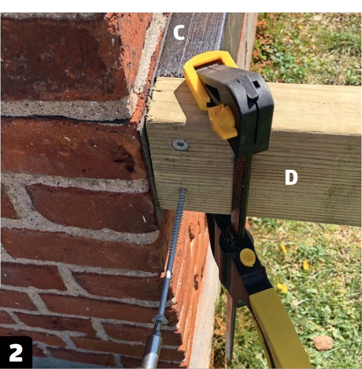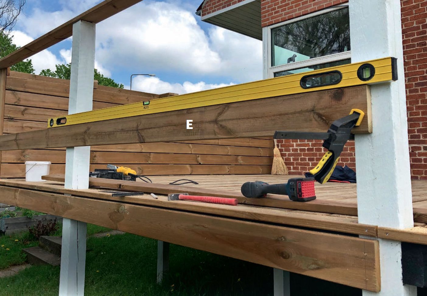 Som ”kledning” til rekkverket brukes også terrassebord (E). Du kan med fordel bruke tvingene til å holde bordene på plass mens du sikrer at de er helt i vater.