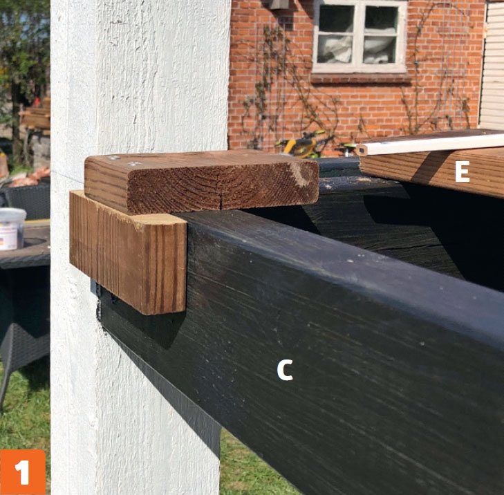 Ved ikke å trekke veggsvillen (C) helt ut til hjørnet, blir det plass til å feste side bjelkene slik at de flukter med husveggen. Tvingen sikrer at høyden blir jevn. Skru den fast med 5 x 100 mm skruer.