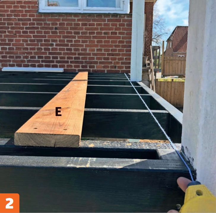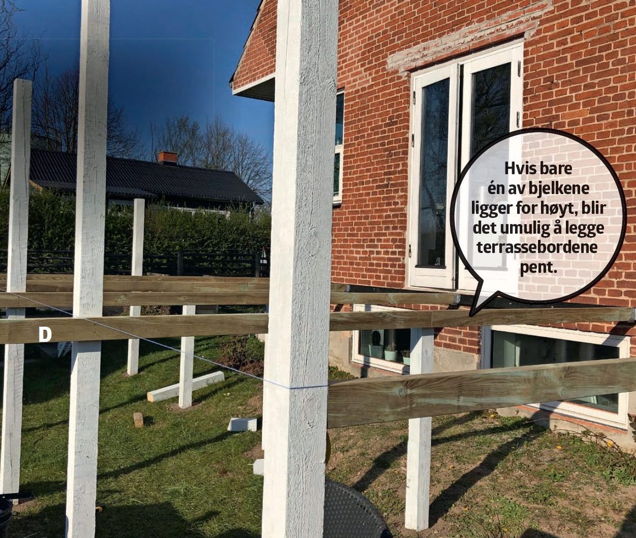 Når bjelkene (D) er satt fast, kontrolleres høyden en ekstra gang med en snor for å sikre at alle bjelkene flukter med hverandre. Vi bruker 5 x 100 mm skruer til monteringen.