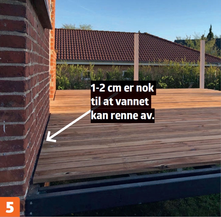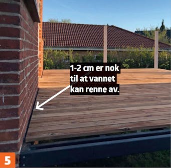 Hold en avstand på et par cm mellom veggen og terrassebordene, slik at regnvannet kan renne av. Bruk eventuelt en list eller noen avstandsklosser for å sikre at avstanden blir den samme hele veien.