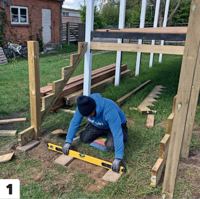 Det første du skal gjøre er å få på plass veggsvillen og bjelken til gulvet. Først svillen på husveggen og deretter bjel kene utenpå de ytterste stolpene. Det er viktig at alt er helt i vater, slik at bjel kene som blir underlaget for terrasse bordene også blir helt i vater.