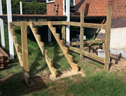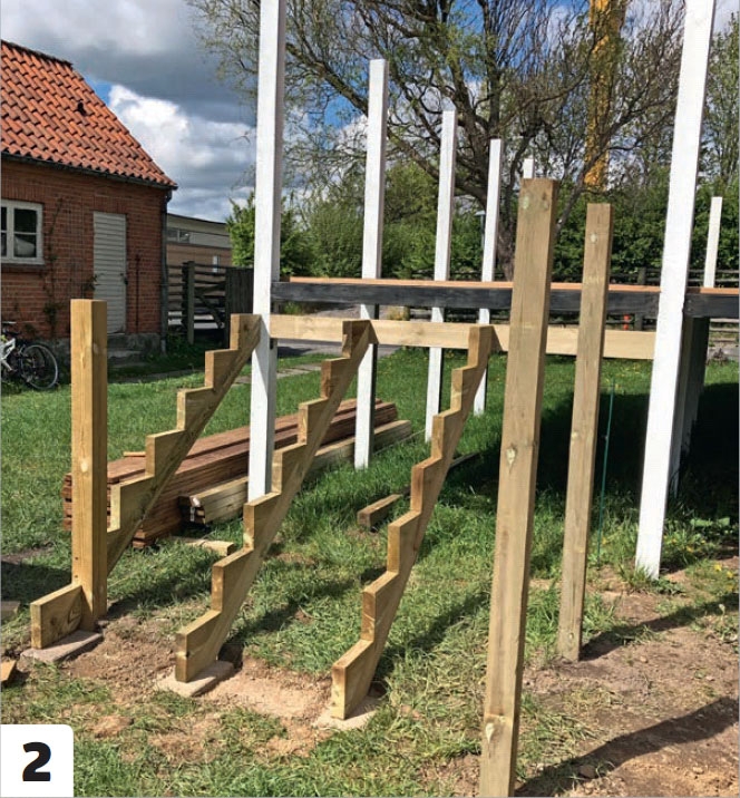 Plasser trappevangene på hellene og skru dem fast i toppen med 5 x 100 mm skruer, slik at selve terrassegulvet blir det siste trappetrinnet.