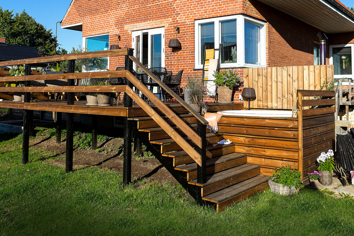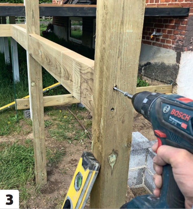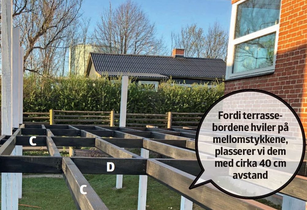 Mellomstykkene (C) forskyves i forhold til hverandre, slik at du kan skru dem fast gjennom de lange bjelkene (D). Langs stolpene ut mot fronten av terrassen settes en ekstra bjelke, ettersom terrassebordene skal ligge på tvers langs kanten. Når skjelettet er ferdig, er det opplagt å behandle det med trebeskyttelse. Vi har valgt svart, men velg den fargen du liker best.