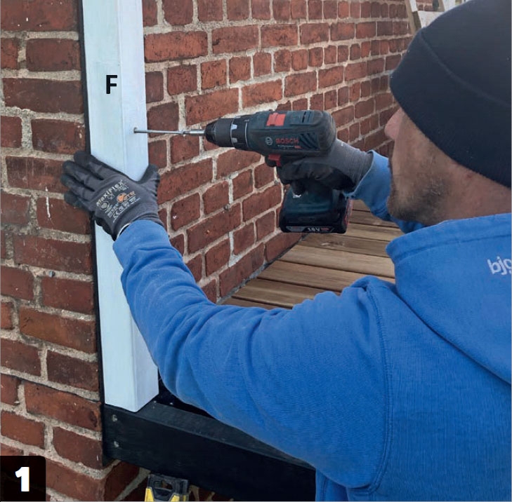 Legg en strimmel murpapp mellom den første stolpen mot endeveggen (F) og veggen, og skru den deretter fast med tre 5 x 100 mm skruer og tilhørende plugger.
