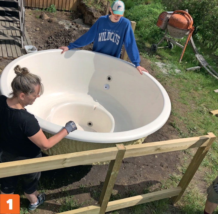 Nå skal badestampen geleides på plass. Vi plasserer den på det lille fundamentet vi har laget og understøtter setene med isoporblokker. Deretter handler det bare om å tilpasse terrassebordene slik at de “fortsetter” inn under kanten av badestampen. Selve tilkoblingen av stampen og rørarbeidet som hører med, overlater vi til en rørlegger.